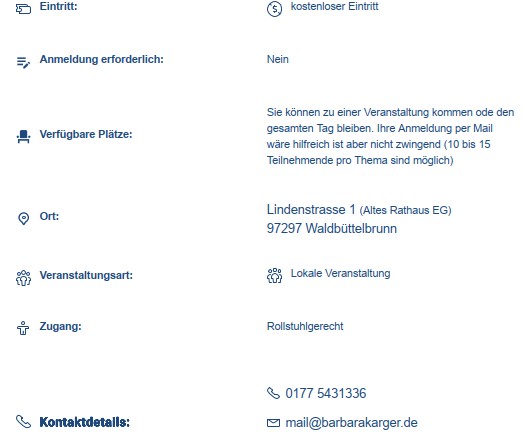 Terminvereinbarungen und Anfragen gerne unter mail@BarbaraKarger.de oder auf meine Mailbox.